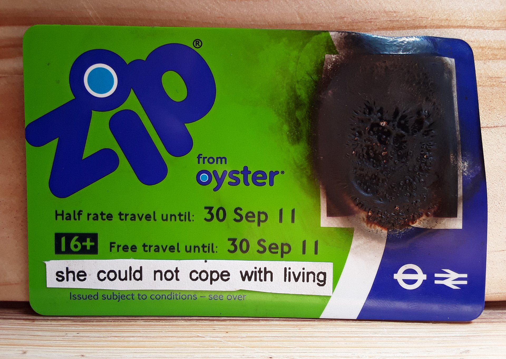 Self Portrait (2014) – oyster card, blowtorch, text from a psychiatric report (‘she’ being me)