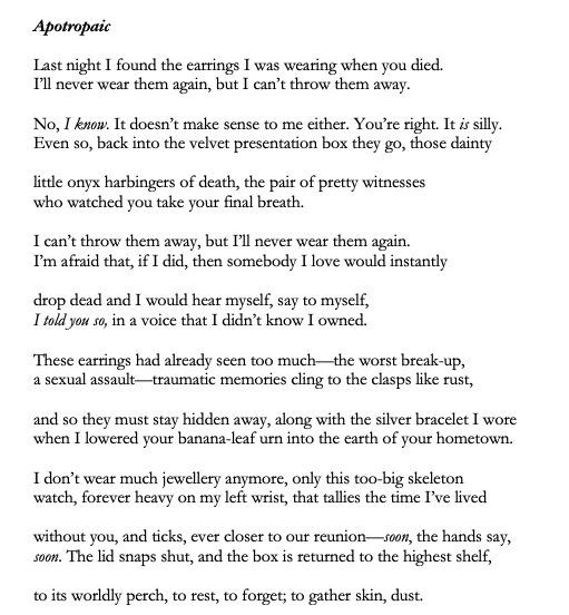 Apotropaic Last night I found the earrings I was wearing when you died. I’ll never wear them again, but I … More